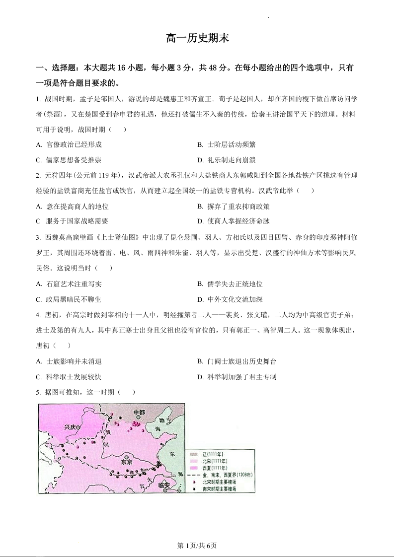 吉林省通化市梅河口市第五中学2023-2024学年高一上学期1月期末考试历史(原卷版)