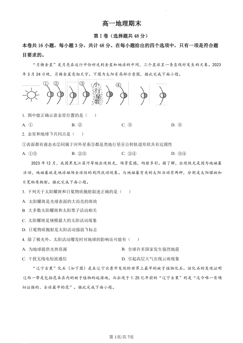 吉林省通化市梅河口市第五中学2023-2024学年高一上学期1月期末考试地理(原卷版)