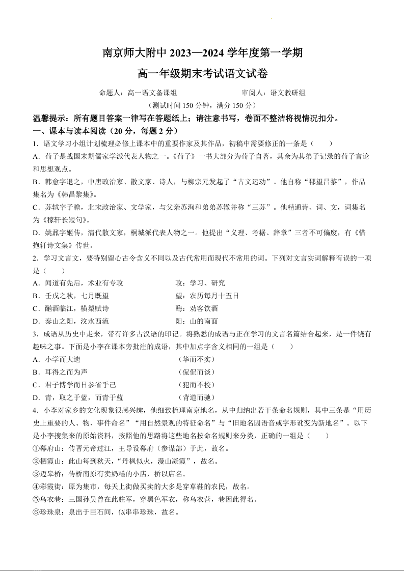 江苏省南京师范大学附属中学2023-2024学年高一上学期期末考试语文
