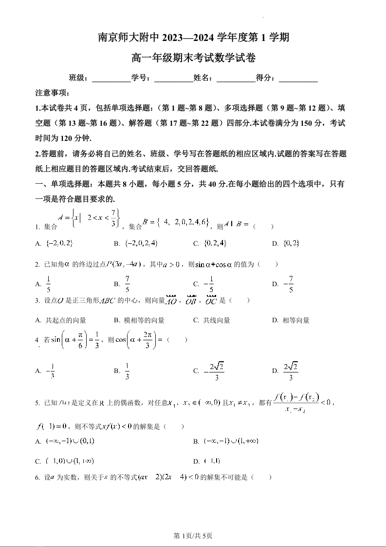 江苏省南京师范大学附属中学2023-2024学年高一上学期期末考试数学(原卷版)