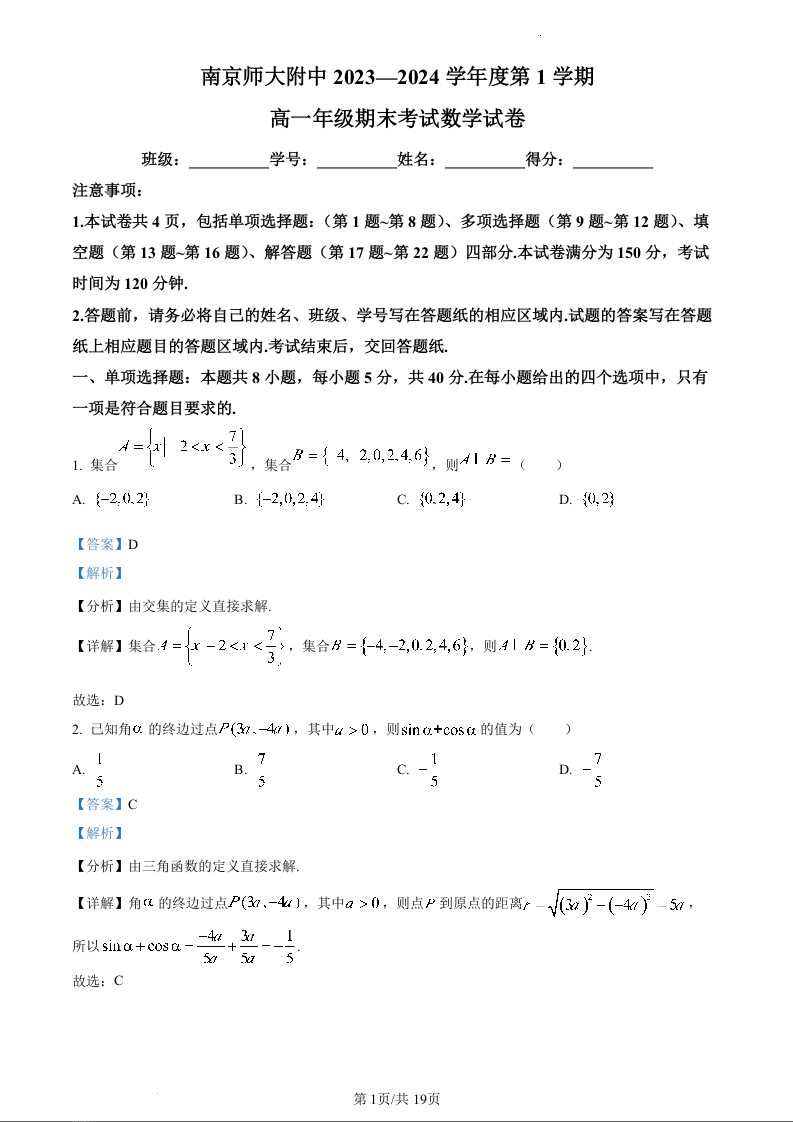 江苏省南京师范大学附属中学2023-2024学年高一上学期期末考试数学(精品解析版)