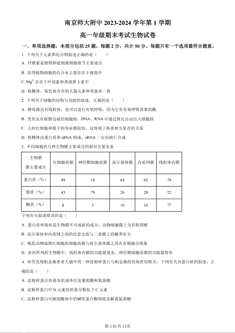 江苏省南京师范大学附属中学2023-2024学年高一上学期期末考试生物(原卷版)