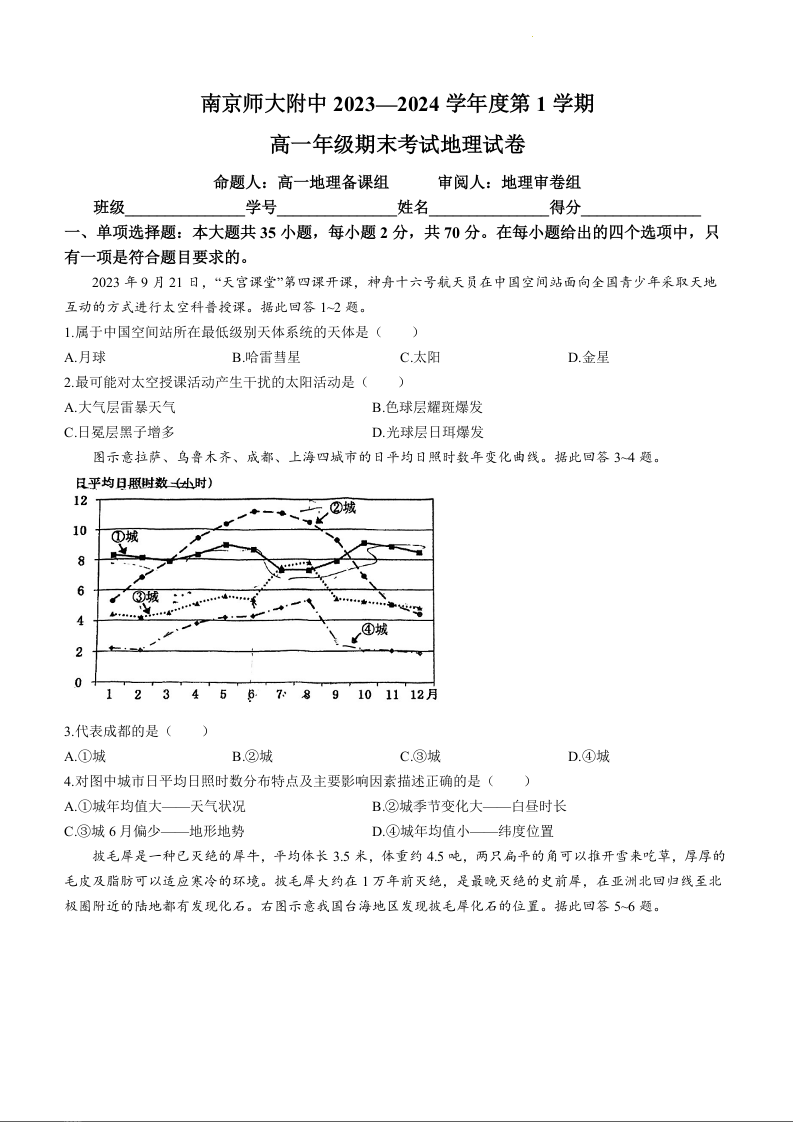 江苏省南京师范大学附属中学2023-2024学年高一上学期期末考试地理