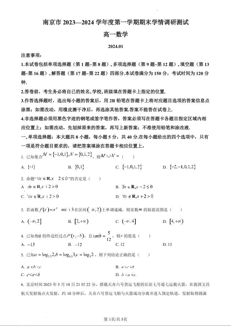 江苏省南京市2023—2024学年高一上学期期末学情调研测试数学(原卷版)