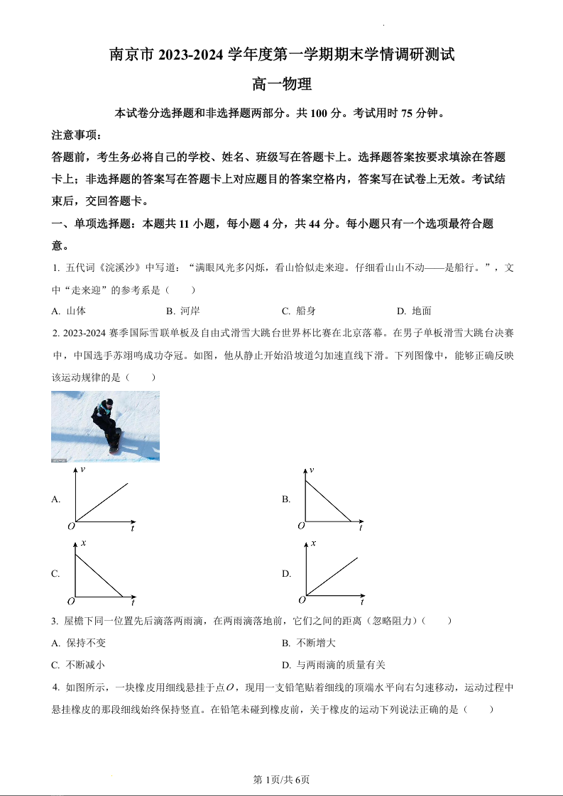 江苏省南京市2023—2024学年高一上学期期末学情调研测试物理(原卷版)