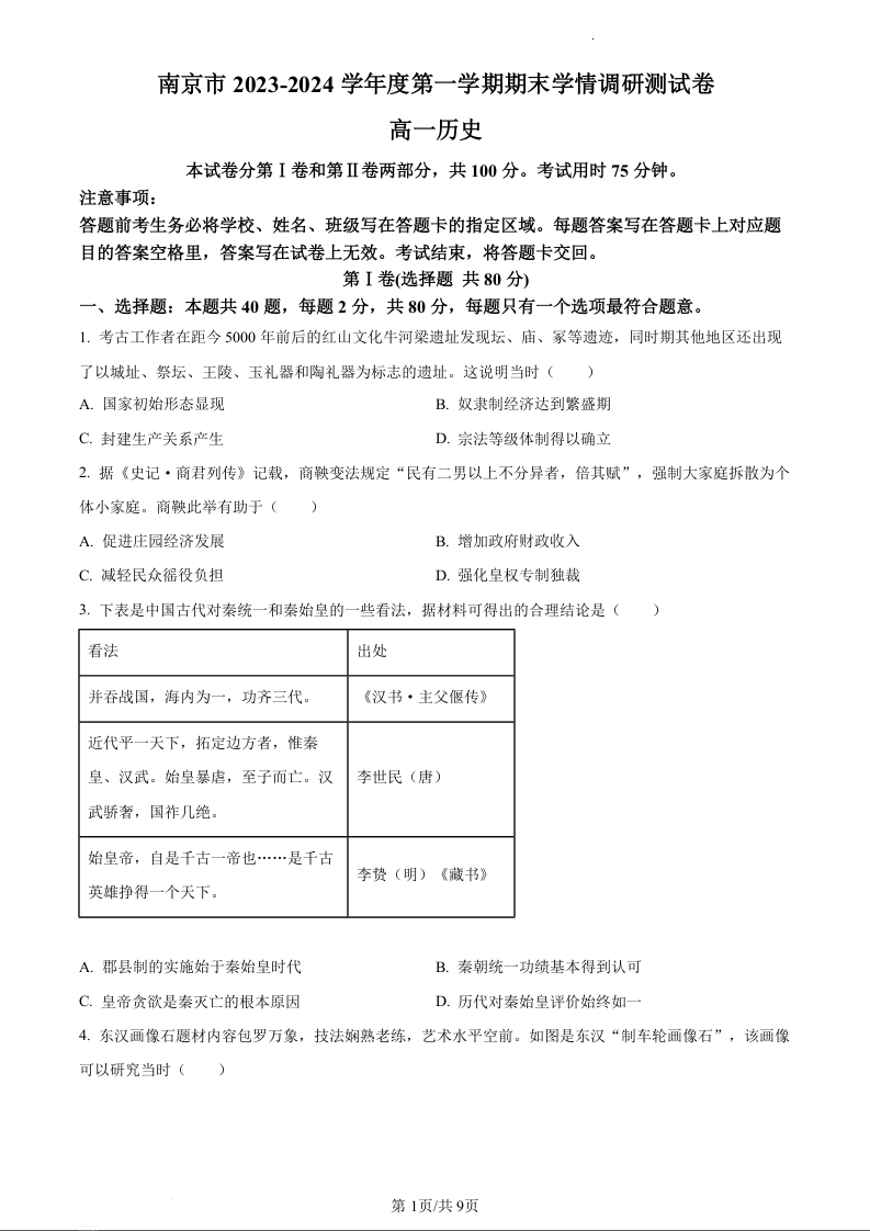 江苏省南京市2023—2024学年高一上学期期末学情调研测试历史(原卷版)