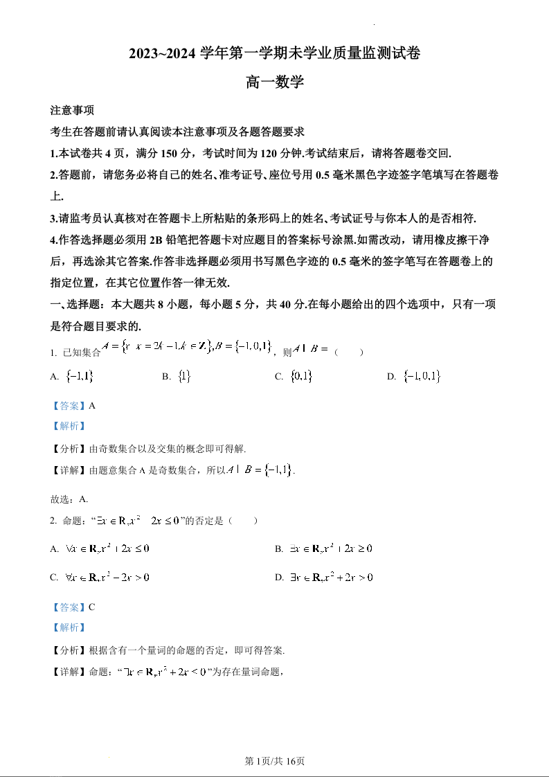 江苏省南通市海安市2023-2024学年高一上学期期末考试数学(精品解析版)
