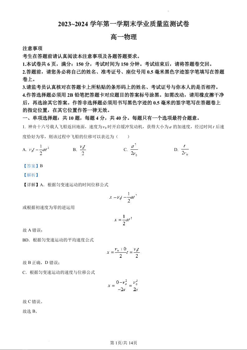 江苏省南通市海安市2023-2024学年高一上学期期末考试物理(精品解析版)