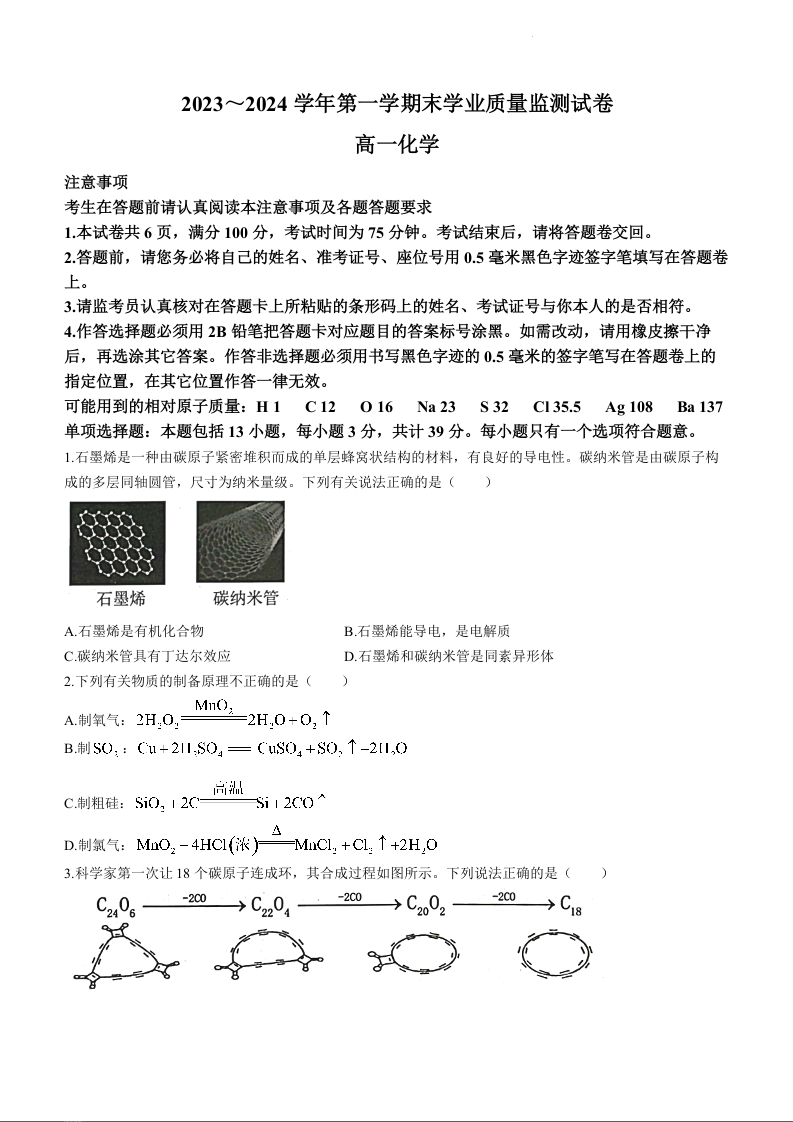 江苏省南通市海安市2023-2024学年高一上学期期末考试化学+答案