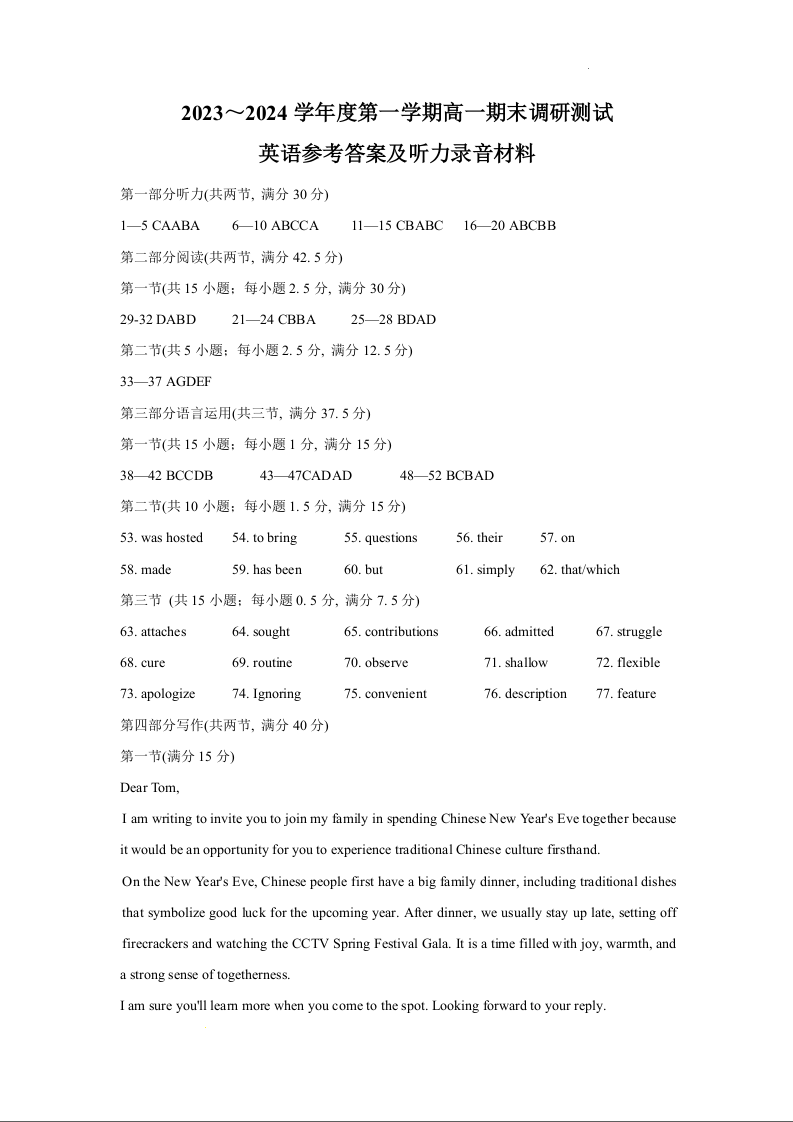 江苏省泰州市2023-2024学年高一上学期1月期末调研测试英语答案