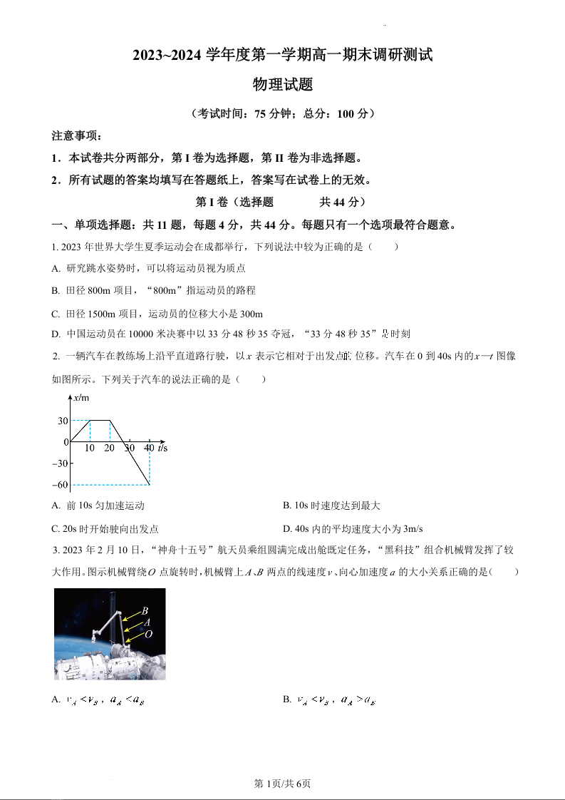 江苏省泰州市2023-2024学年高一上学期1月期末调研测试物理(原卷版)