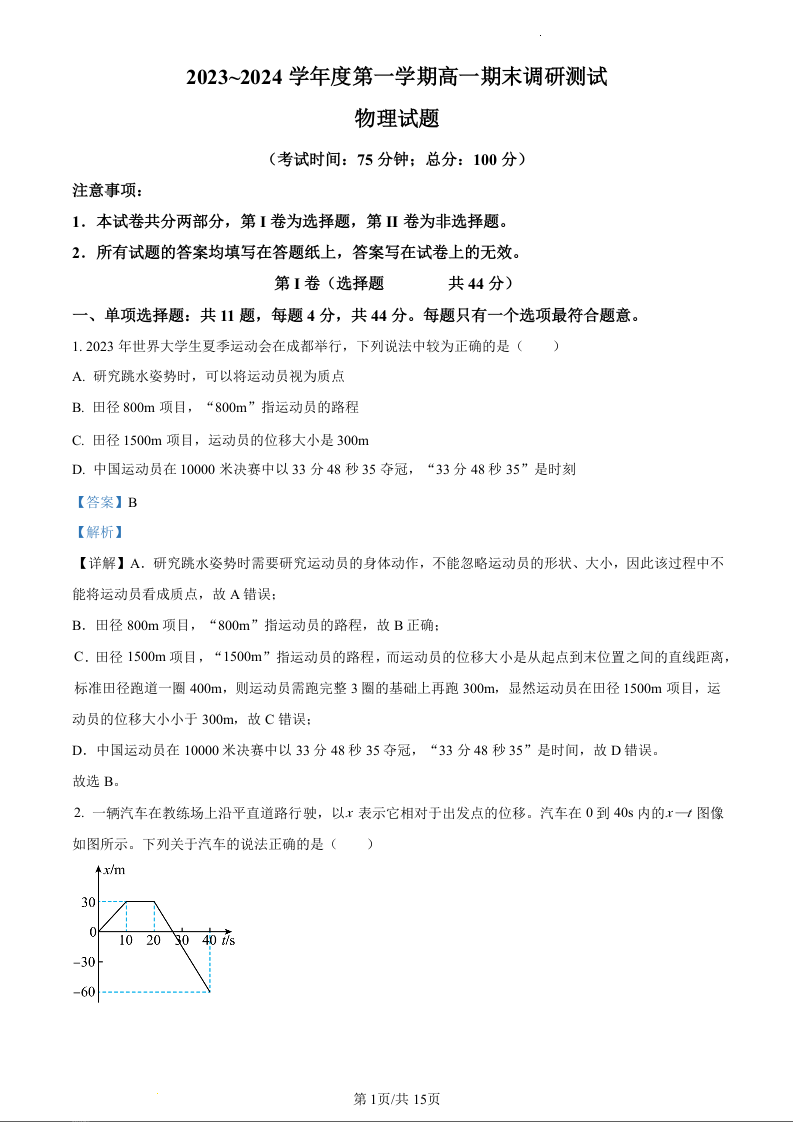 江苏省泰州市2023-2024学年高一上学期1月期末调研测试物理(精品解析版)