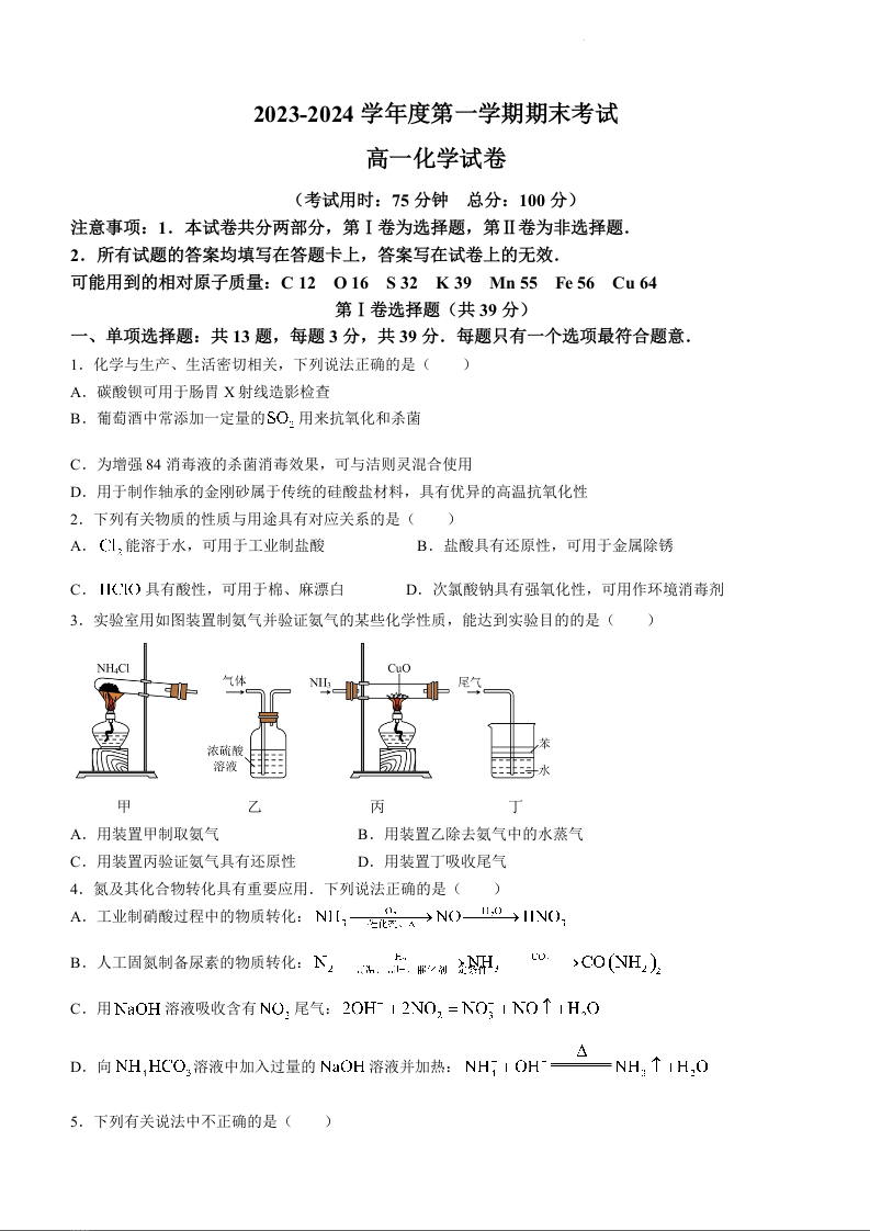 江苏省泰州市2023-2024学年高一上学期1月期末调研测试化学+答案