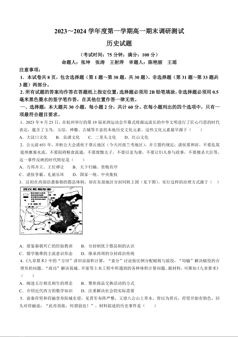 江苏省泰州市2023-2024学年高一上学期1月期末调研测试历史