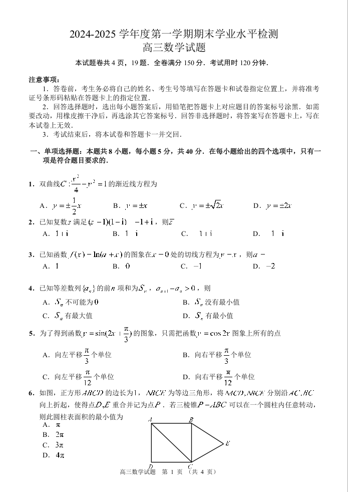 山东省青岛市2024-2025学年度第一学期高三期末学业水平检测数学