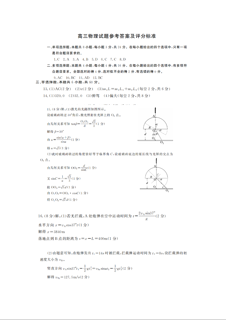 山东省潍坊市2024-2025学年第一学期高三期末考试物理答案