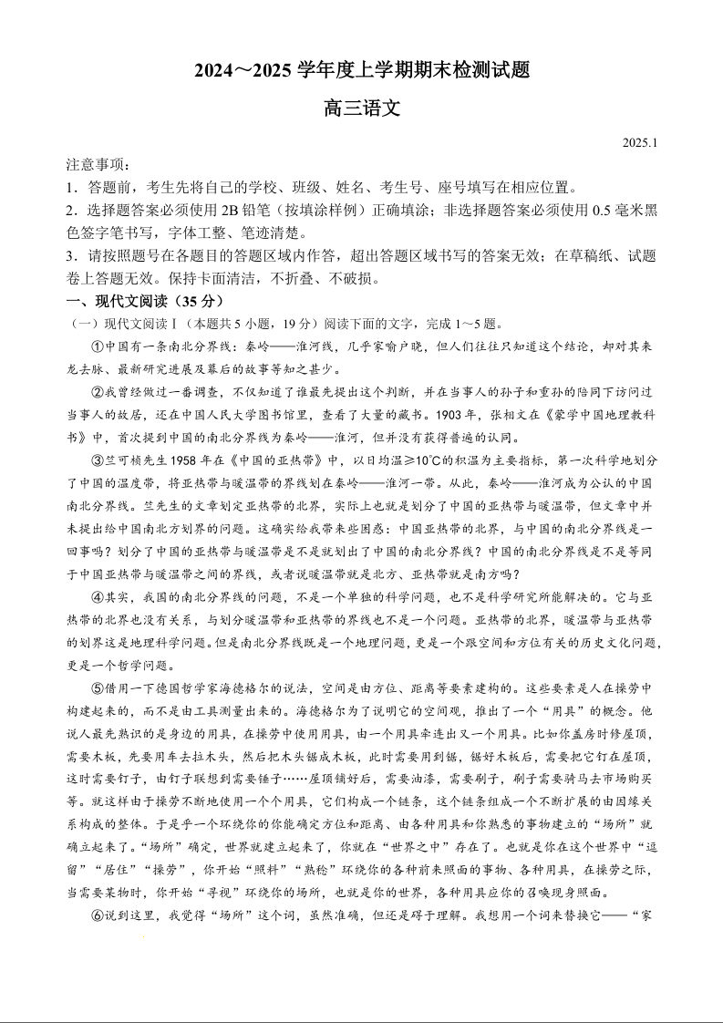 山东省潍坊市2024-2025学年度上学期1月高三年级期末检测语文+答案
