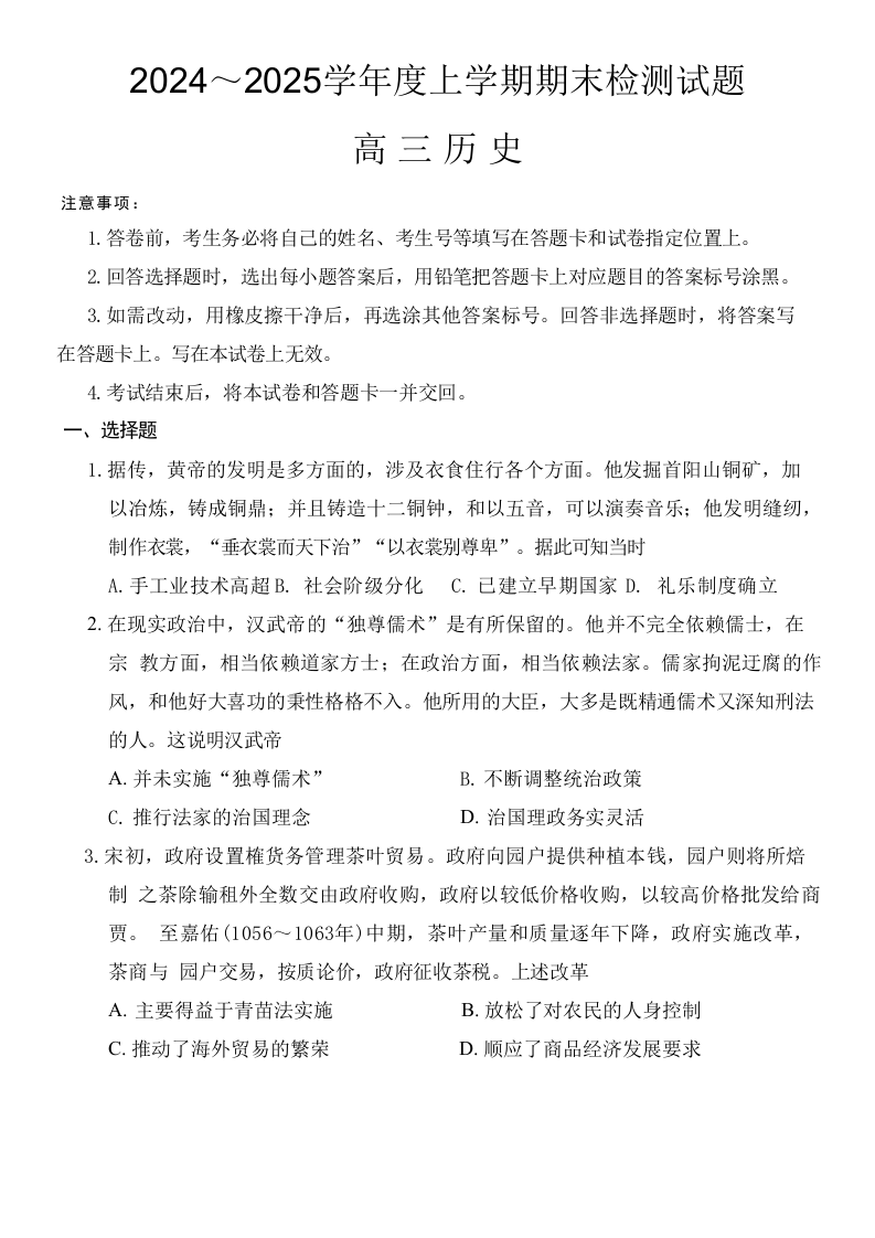 山东省潍坊市2024-2025学年度上学期1月高三年级期末检测历史+答案