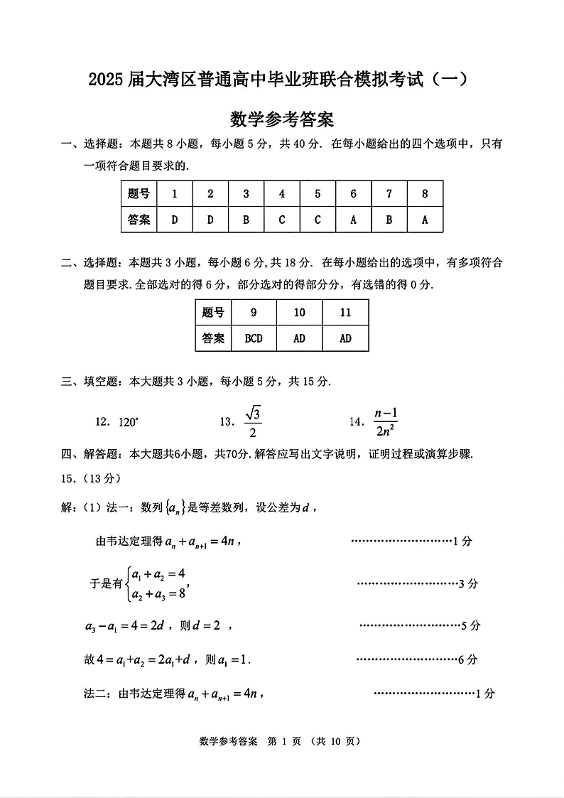 广东省大湾区普通高中2024-2025学年上学期毕业年级联合模拟数学答案