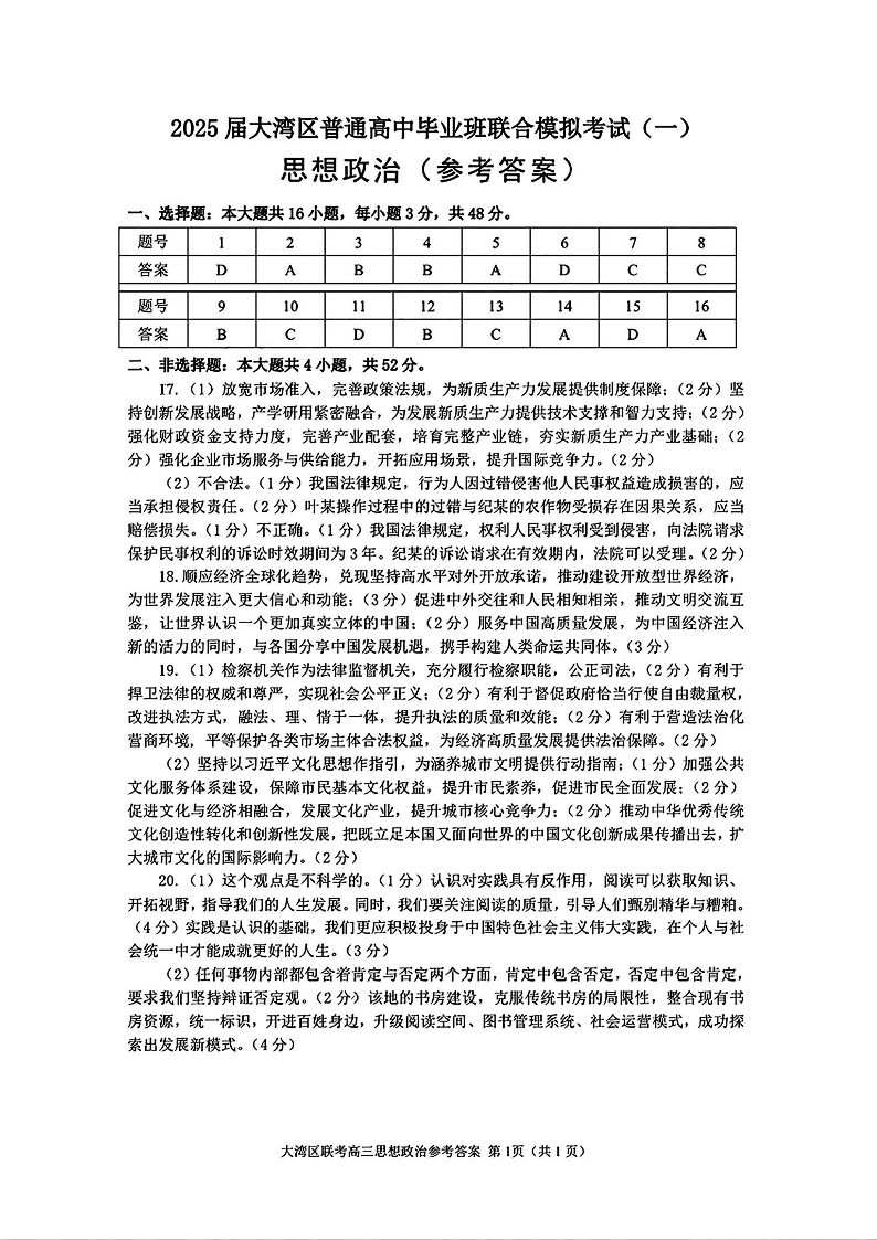 广东省大湾区普通高中2024-2025学年上学期毕业年级联合模拟政治答案