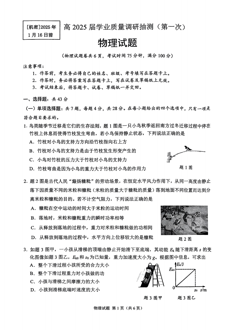 重庆市主城区2024-2025学年1月高三期末学业质量调研物理