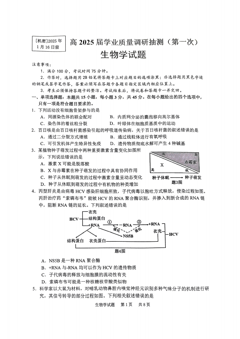 重庆市主城区2024-2025学年1月高三期末学业质量调研生物