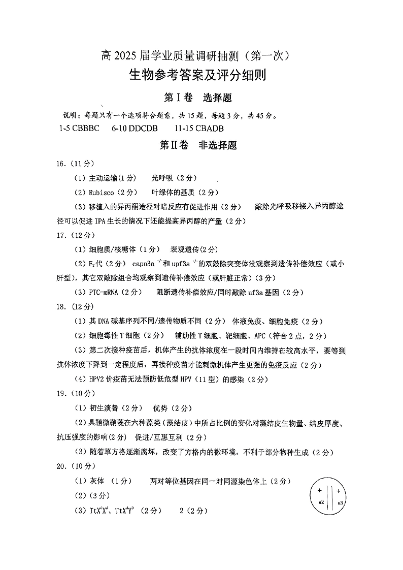 重庆市主城区2024-2025学年1月高三期末学业质量调研生物答案
