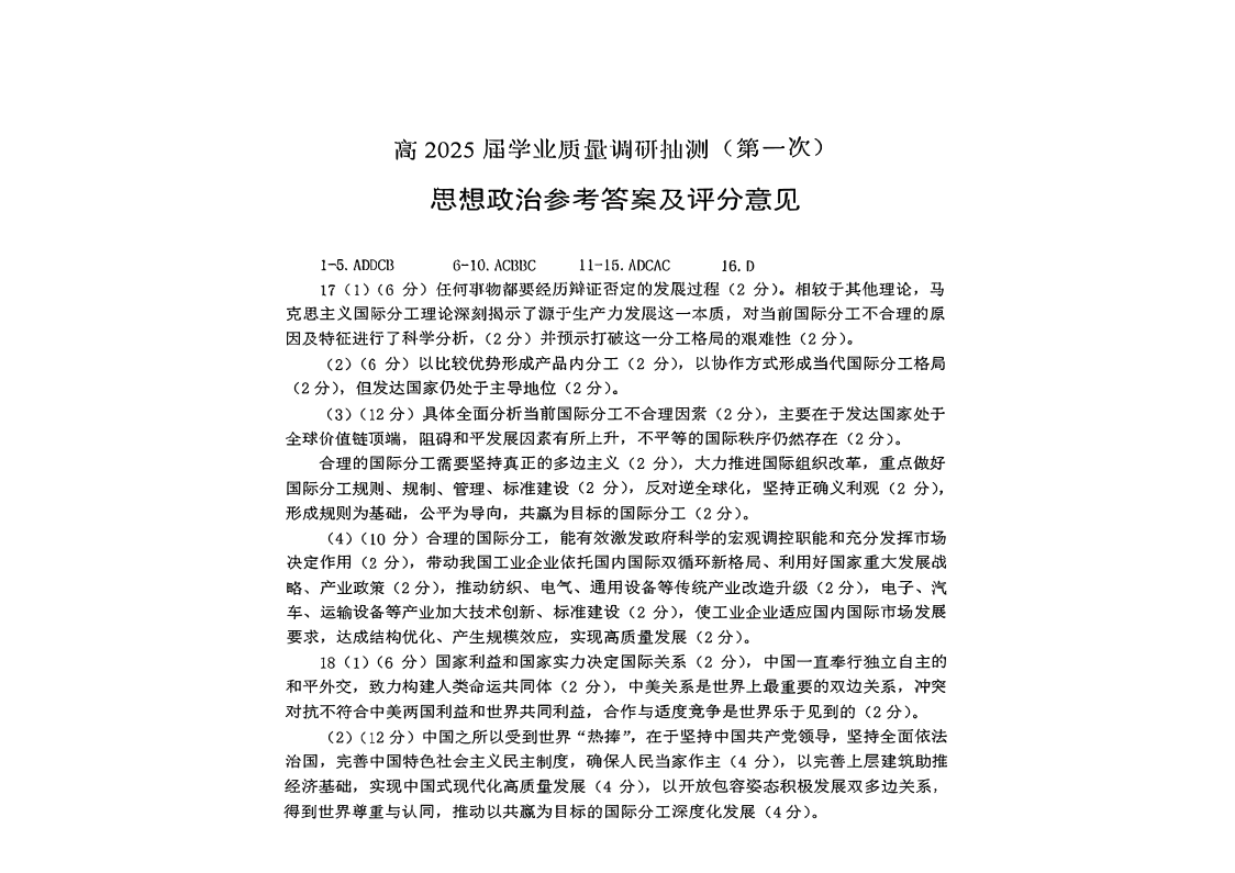 重庆市主城区2024-2025学年1月高三期末学业质量调研政治答案