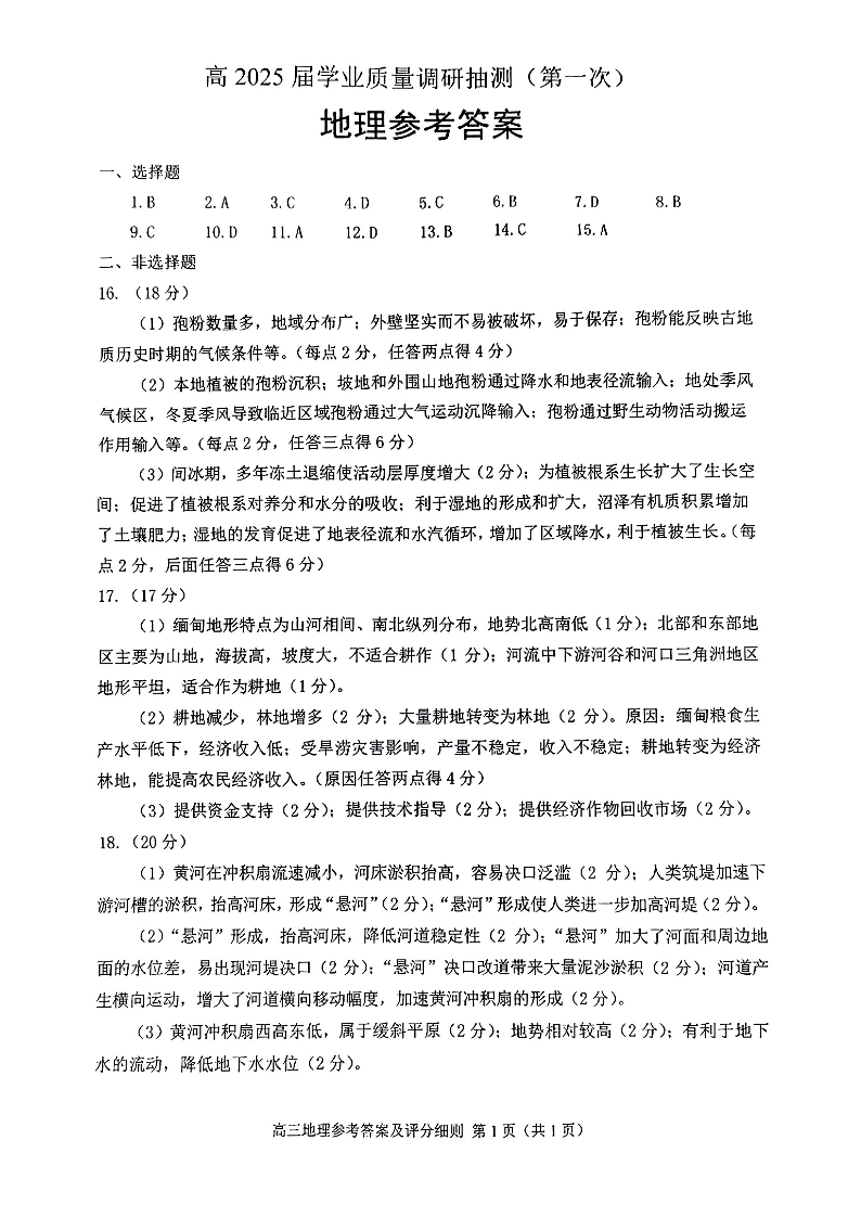 重庆市主城区2024-2025学年1月高三期末学业质量调研地理答案