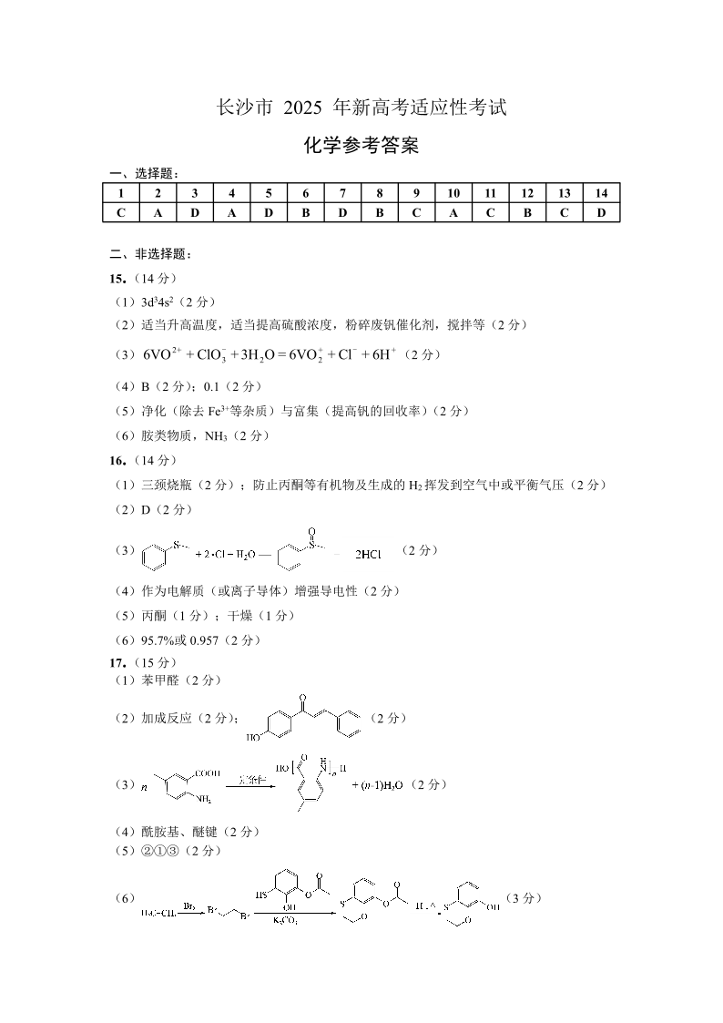 湖南省长沙市2024-2025学年高三上学期高三新高考适应性考试化学答案