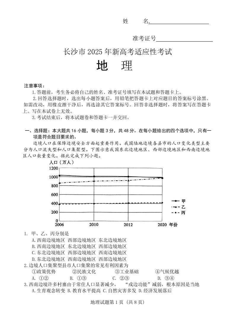 湖南省长沙市2024-2025学年高三上学期高三新高考适应性考试地理+答案