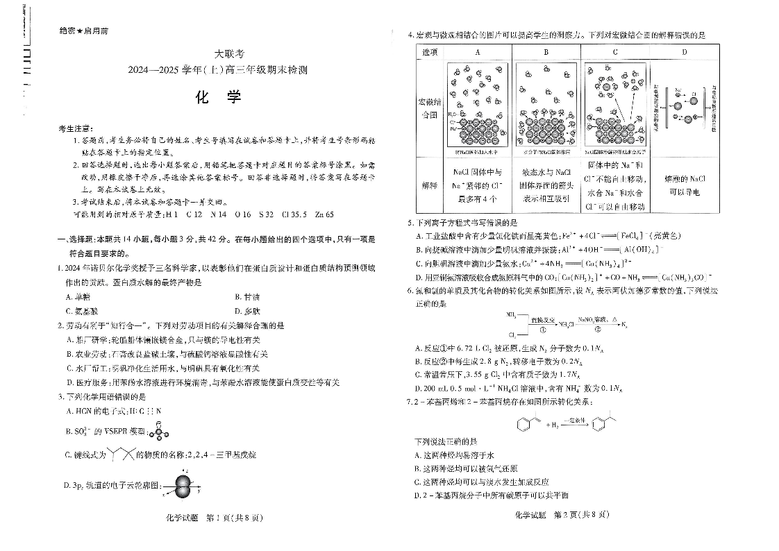 河南省区域高中2024-2025学年上学期1月高三期末考试化学
