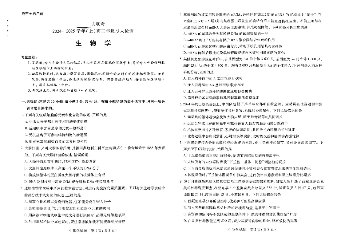 河南省区域高中2024-2025学年上学期1月高三期末考试生物