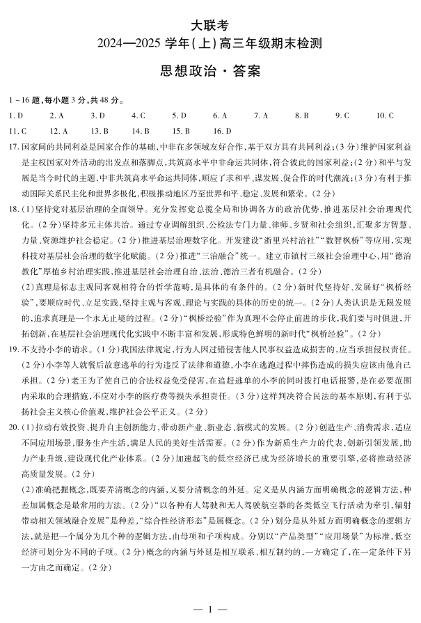 河南省区域高中2024-2025学年上学期1月高三期末考试政治答案