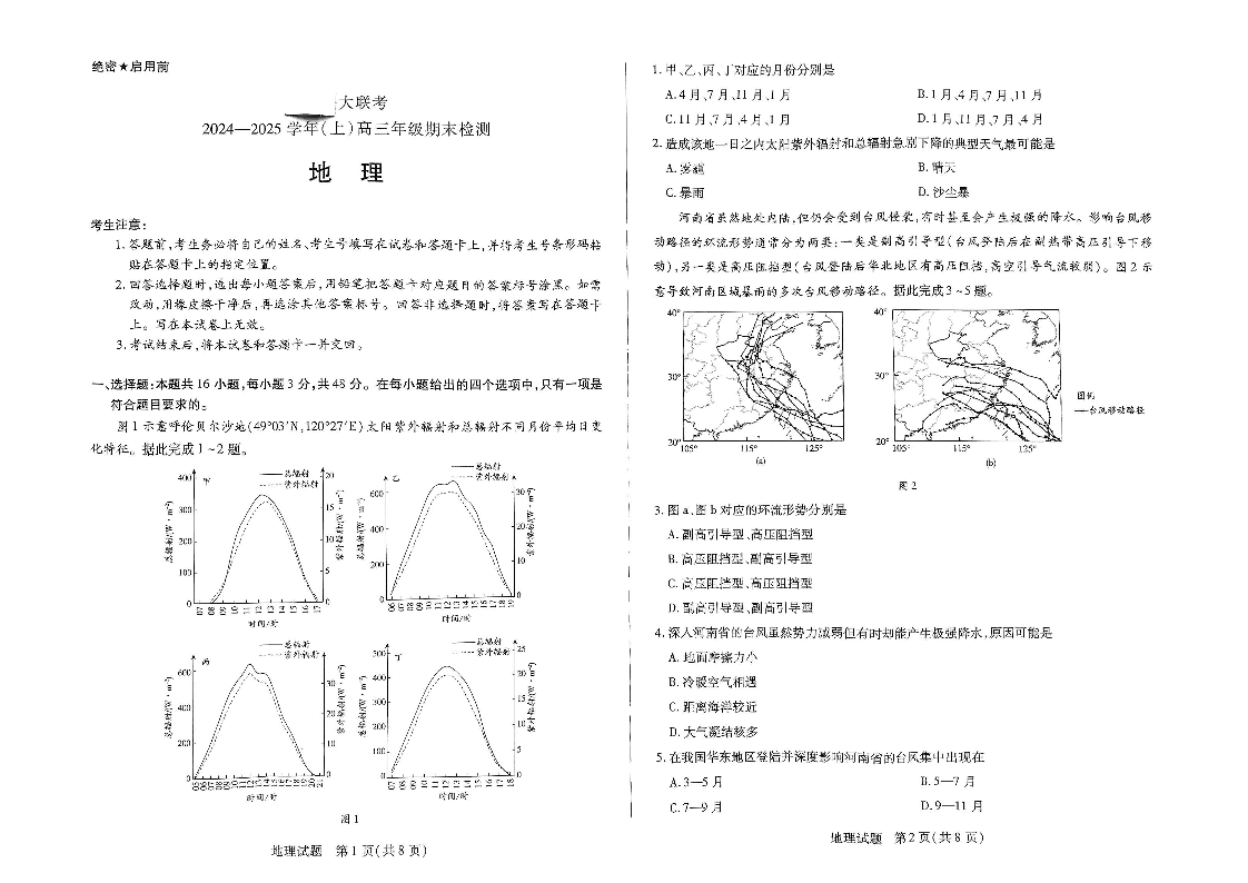 河南省区域高中2024-2025学年上学期1月高三期末考试地理