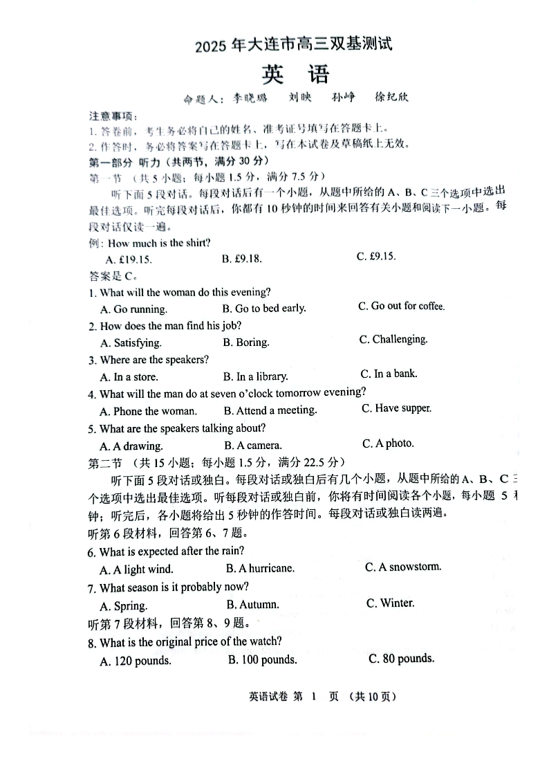 辽宁省大连市2024-2025学年上学期1月高三双基测试英语
