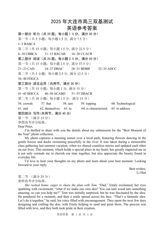 辽宁省大连市2024-2025学年上学期1月高三双基测试英语答案