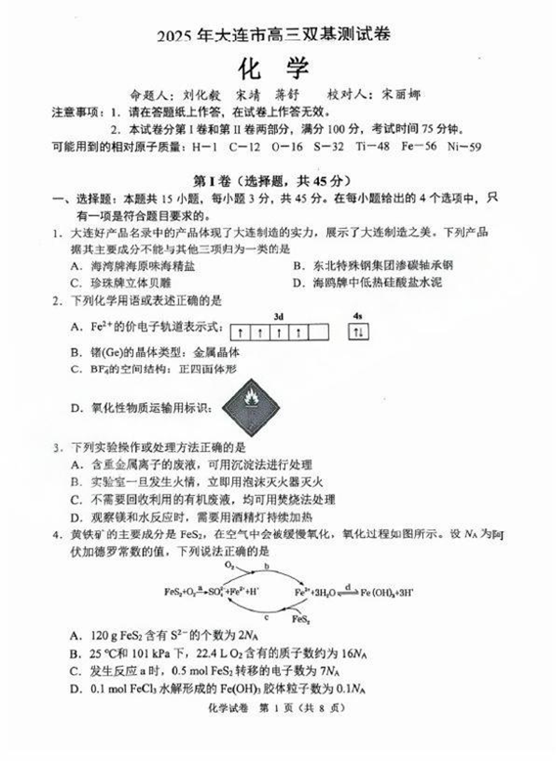 辽宁省大连市2024-2025学年上学期1月高三双基测试化学