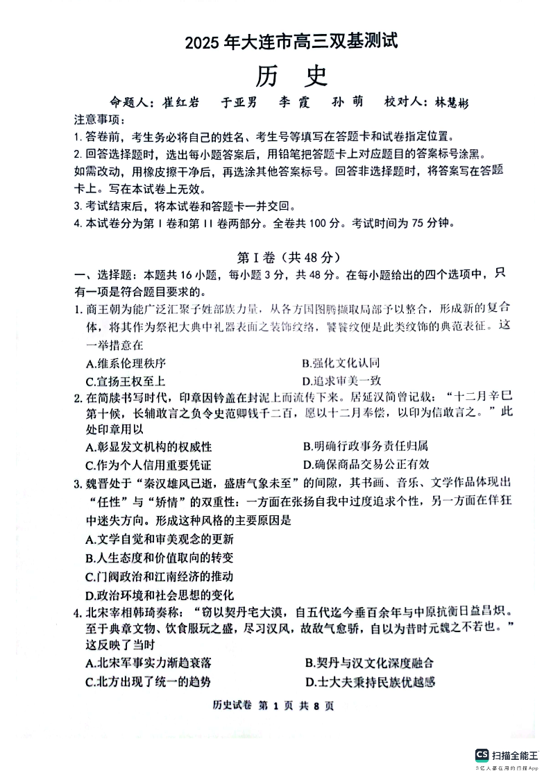 辽宁省大连市2024-2025学年上学期1月高三双基测试历史