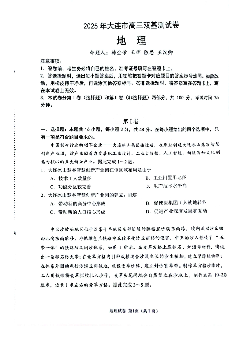 辽宁省大连市2024-2025学年上学期1月高三双基测试地理