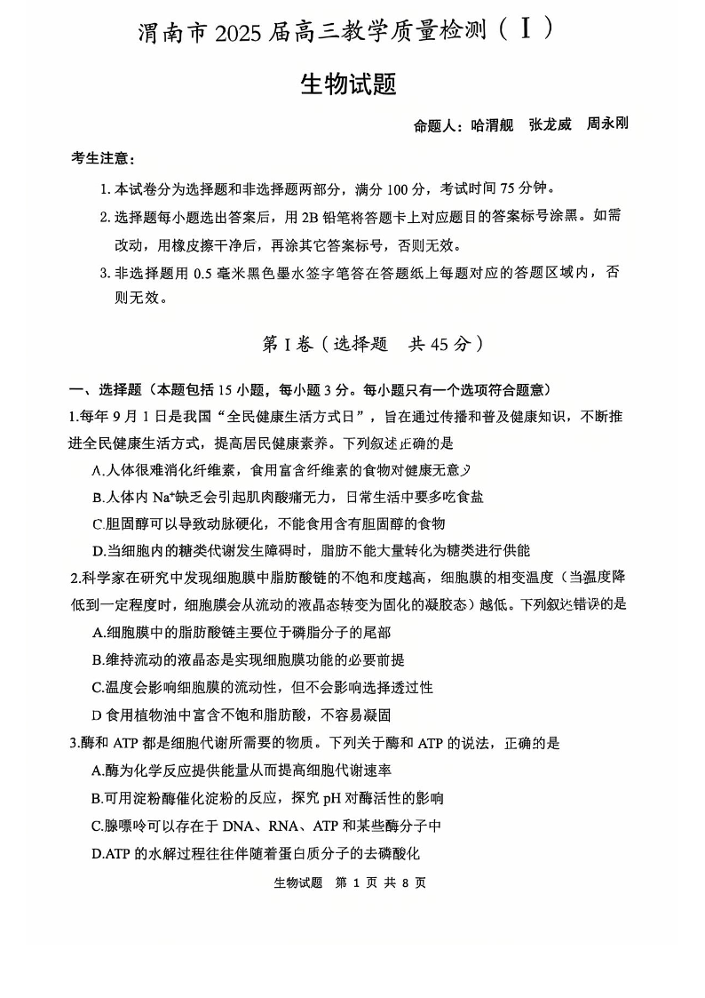 陕西省渭南市2025届高三上学期第一次模拟(渭南一模)生物+答案