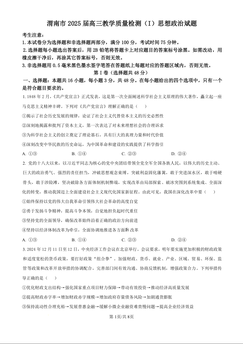 陕西省渭南市2025届高三上学期第一次模拟(渭南一模)政治(原卷版)