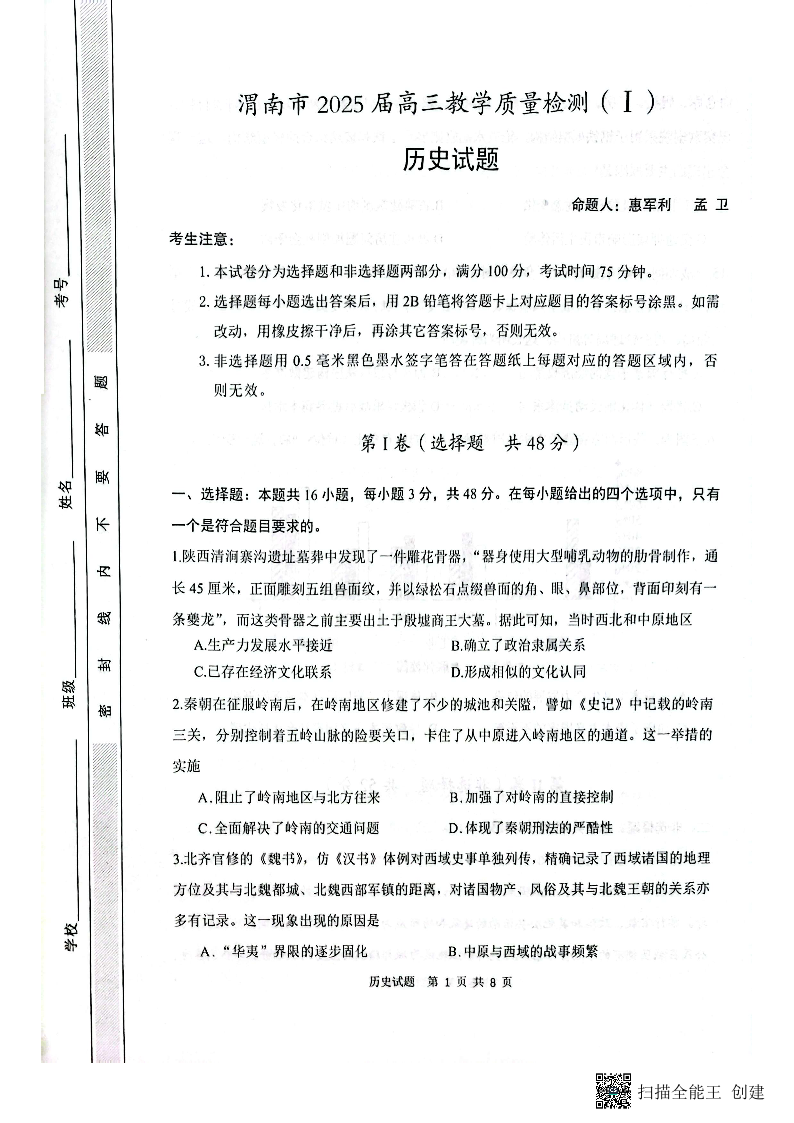 陕西省渭南市2025届高三上学期第一次模拟(渭南一模)历史+答案