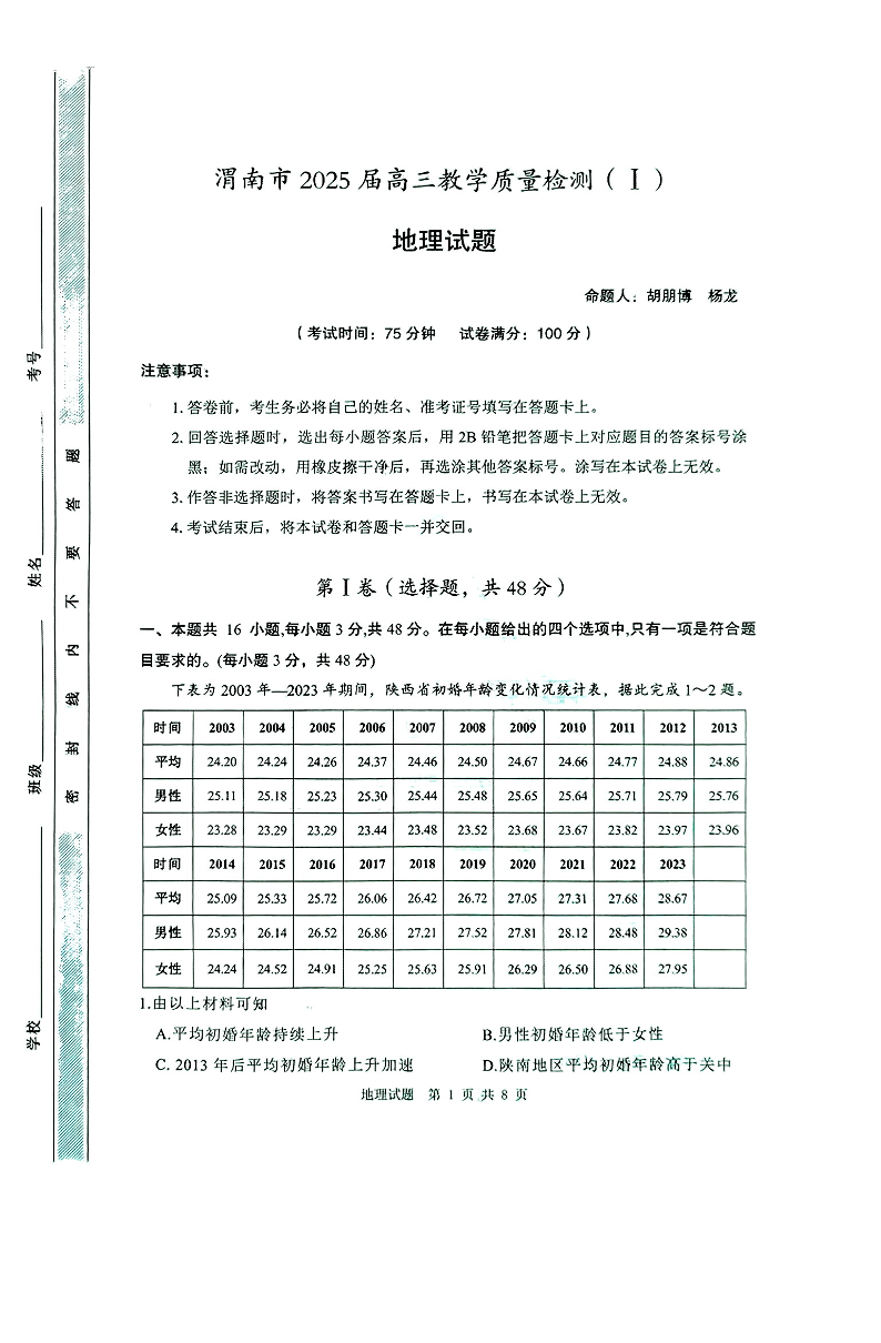 陕西省渭南市2025届高三上学期第一次模拟(渭南一模)地理