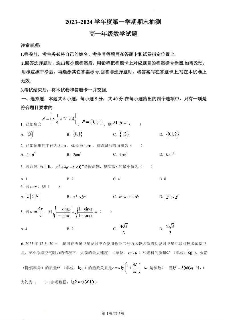 江苏省徐州市2023-2024学年高一上学期期末抽测数学(原卷版)