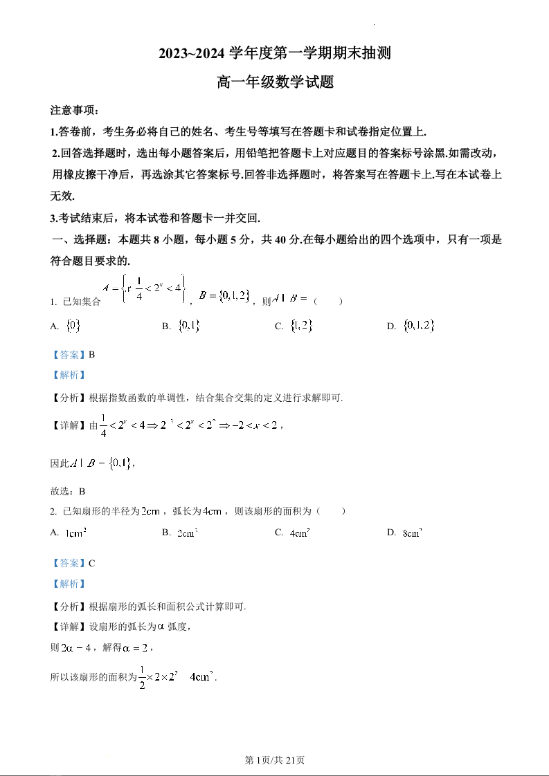 江苏省徐州市2023-2024学年高一上学期期末抽测数学(精品解析版)