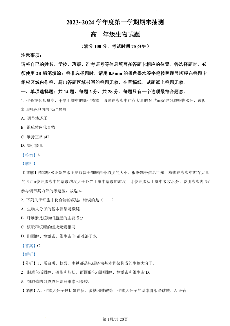 江苏省徐州市2023-2024学年高一上学期期末抽测生物(精品解析版)