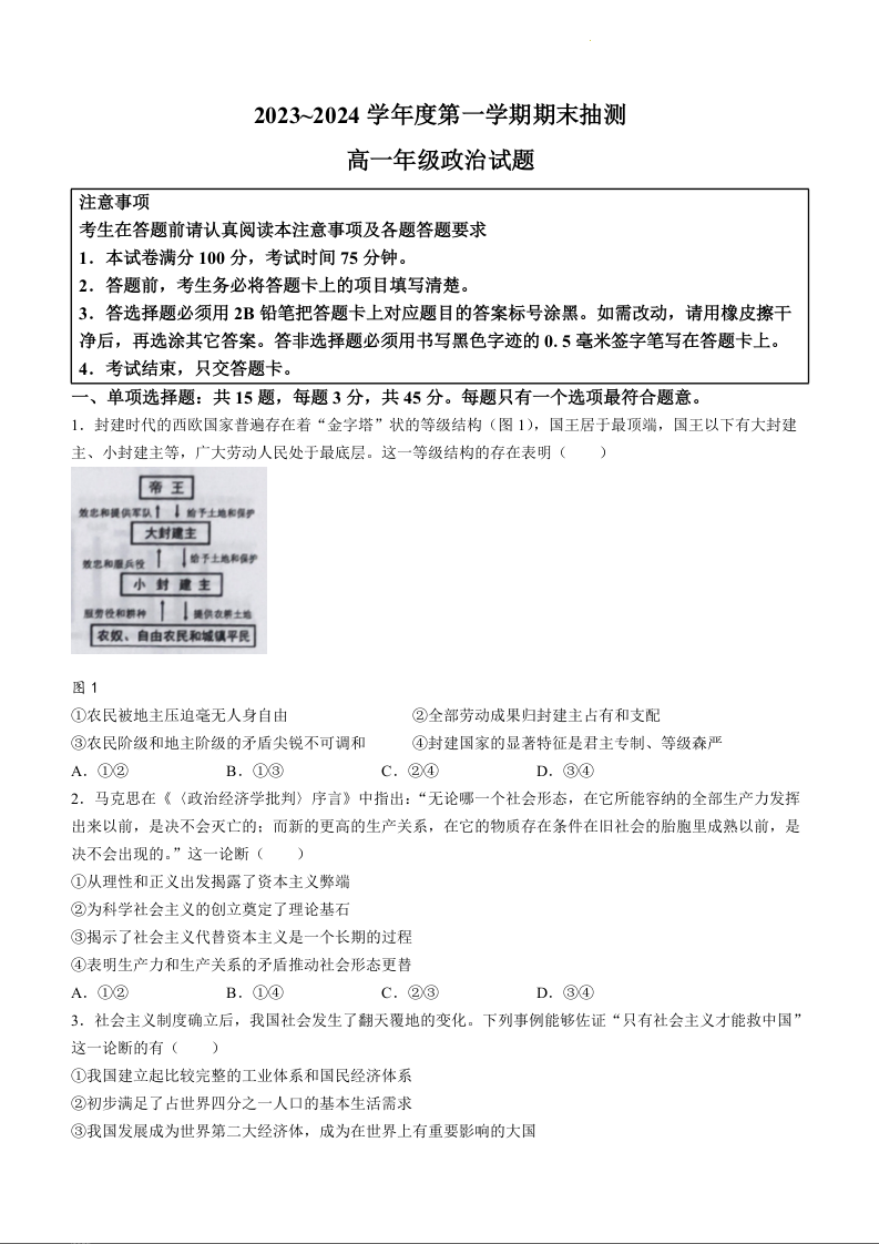 江苏省徐州市2023-2024学年高一上学期期末抽测政治