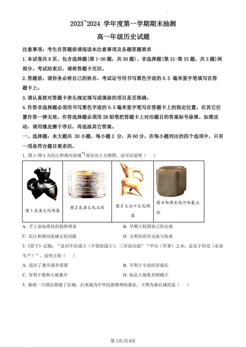 江苏省徐州市2023-2024学年高一上学期期末抽测历史(原卷版)