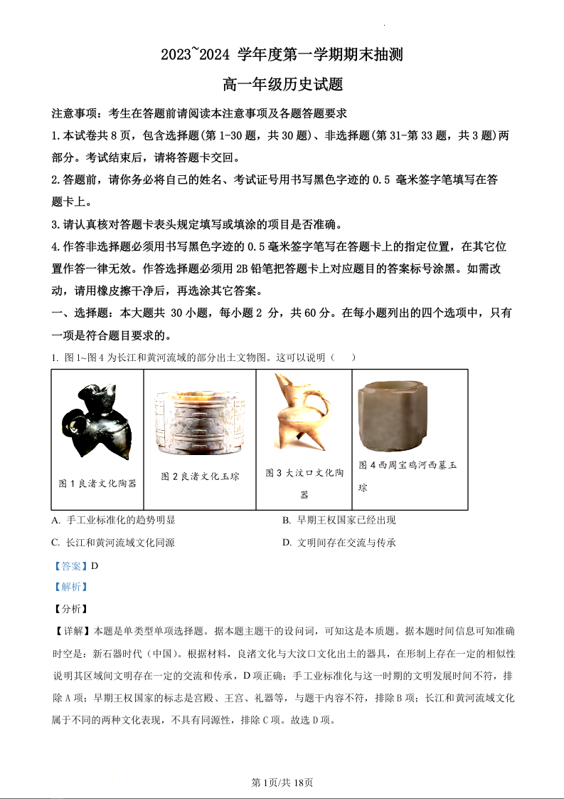 江苏省徐州市2023-2024学年高一上学期期末抽测历史(精品解析版)
